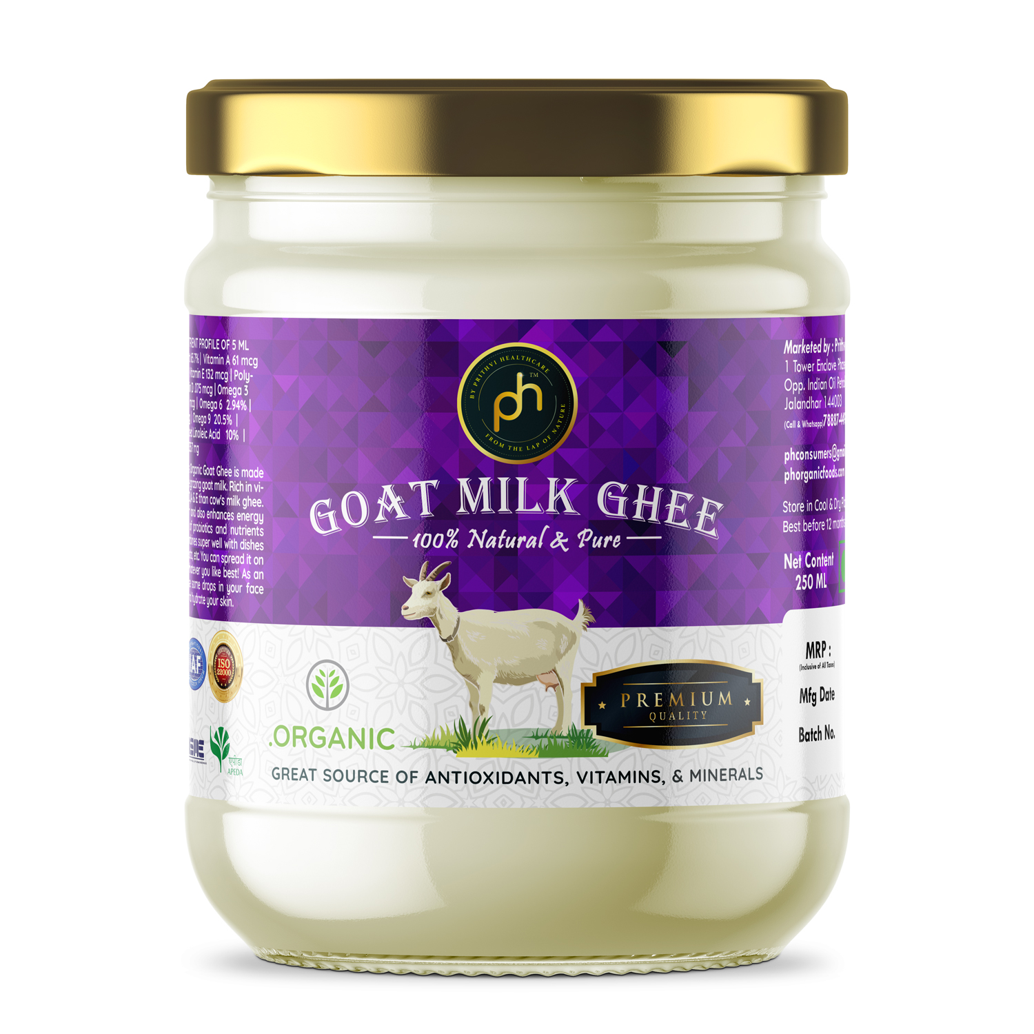 PH Organic Goat Ghee is a rare and premium Ayurvedic superfood crafted from 100% organic goat milk, sourced from ethically raised, grass-fed goats. Prepared using traditional slow-heating methods, this ghee retains its natural aroma, golden color, and therapeutic properties as described in classical Ayurvedic texts.