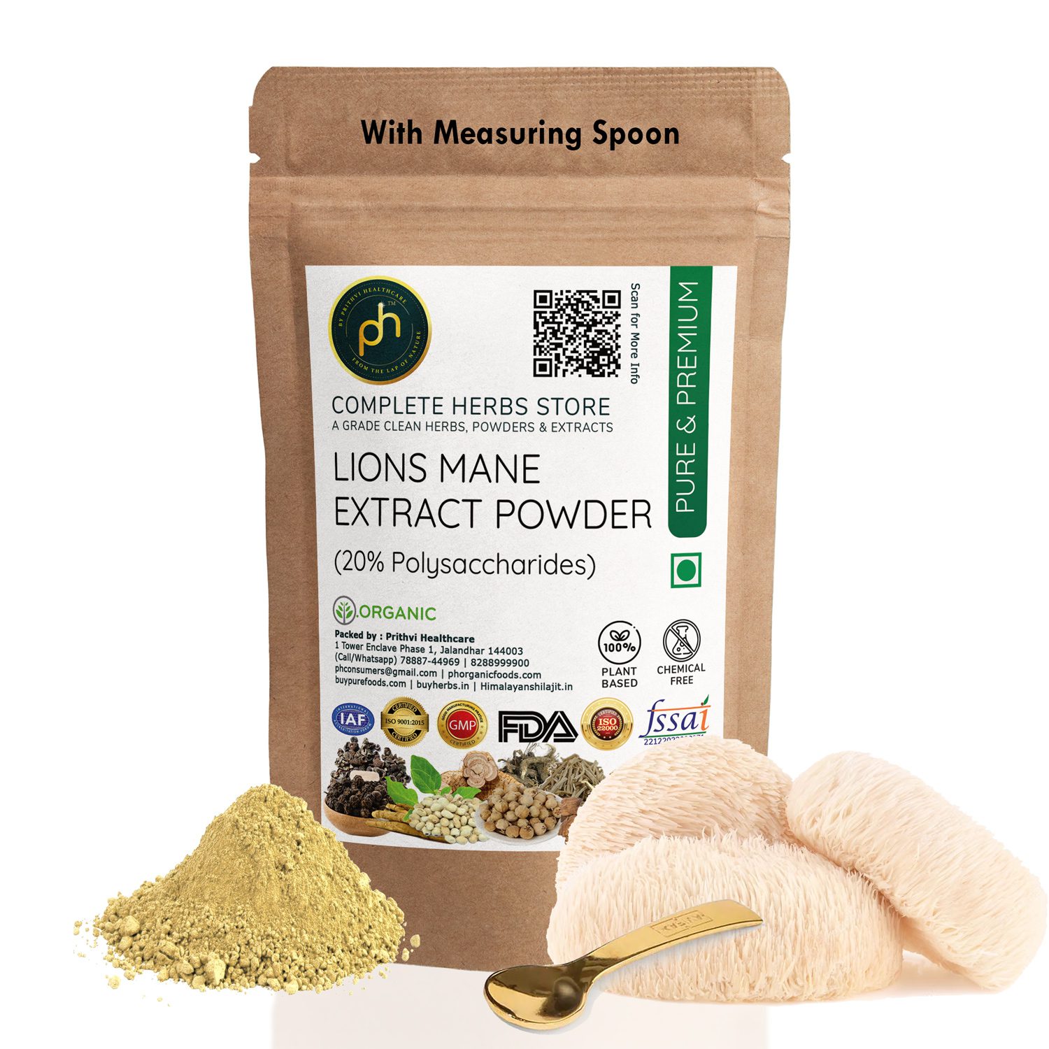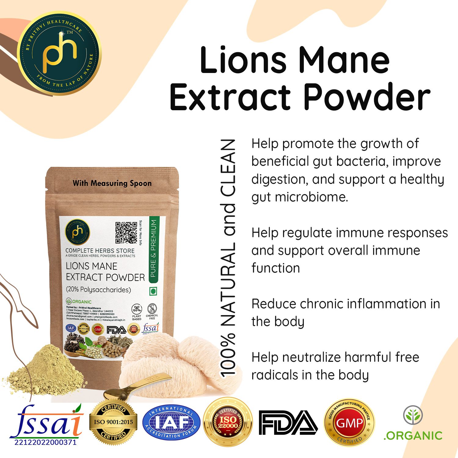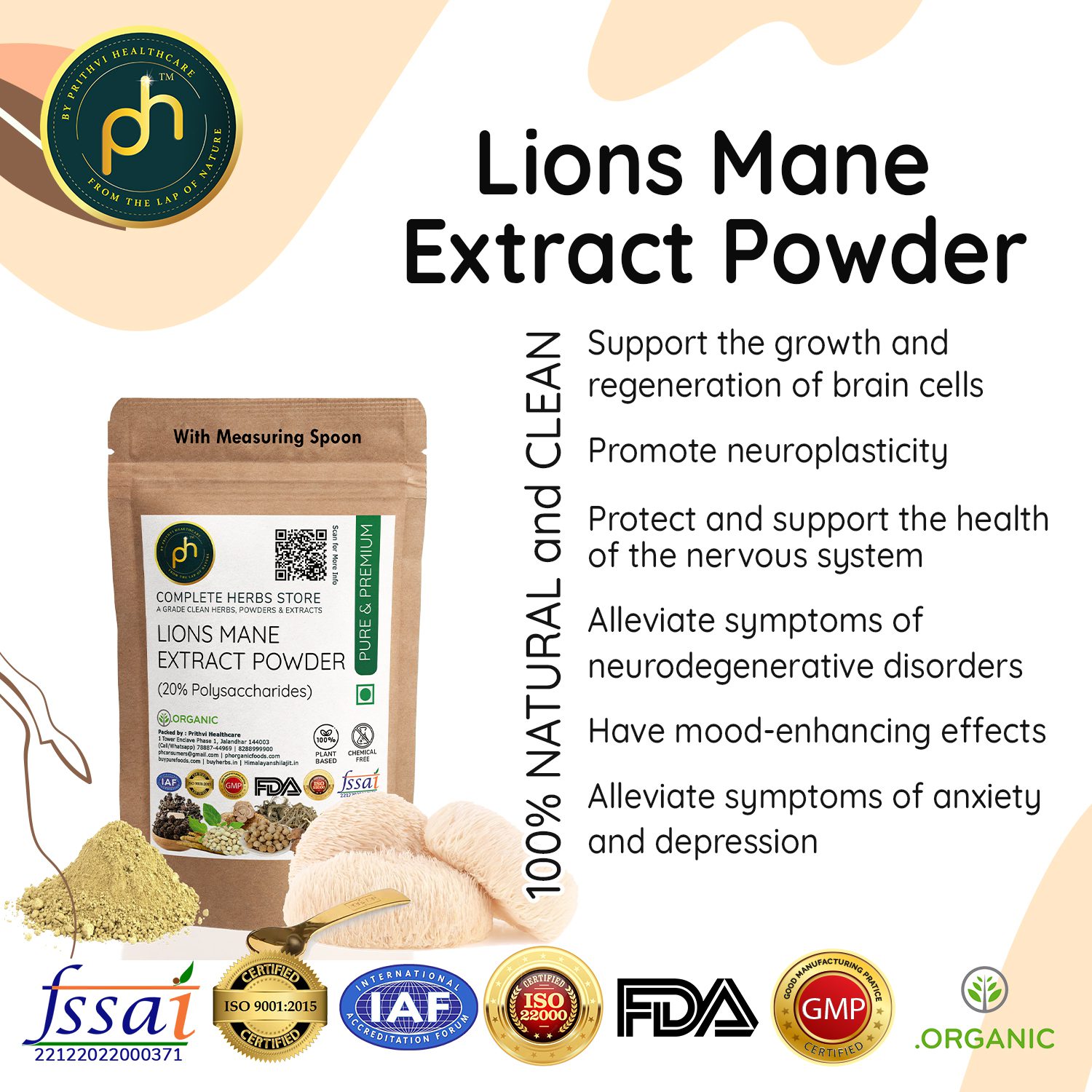 PH Organic Lion’s Mane Mushroom Powder (Hericium erinaceus) is a premium-quality, standardized extract formulated to support brain health, nerve regeneration, memory, focus, and overall mental clarity. Sourced from organically cultivated Lion’s Mane mushrooms and processed using advanced extraction technology, this powder contains 20% active polysaccharides, ensuring superior potency and absorption.