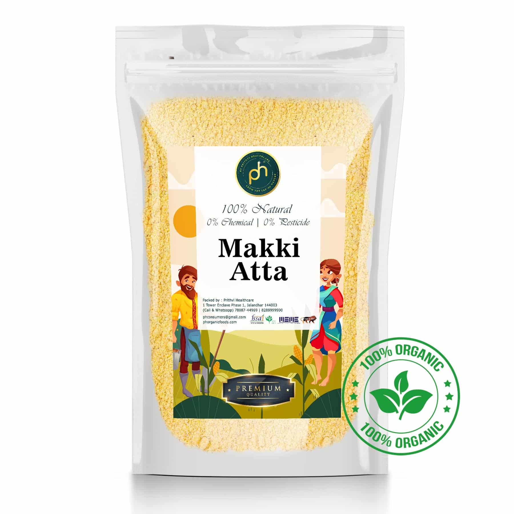Makki Atta (Organic Corn Flour) is made by grinding dried organic maize (corn). It is yellow in color, slightly coarse, and gluten-free. Popular in Indian cuisine, especially in winter, it’s used to make traditional dishes like Makki ki Roti.