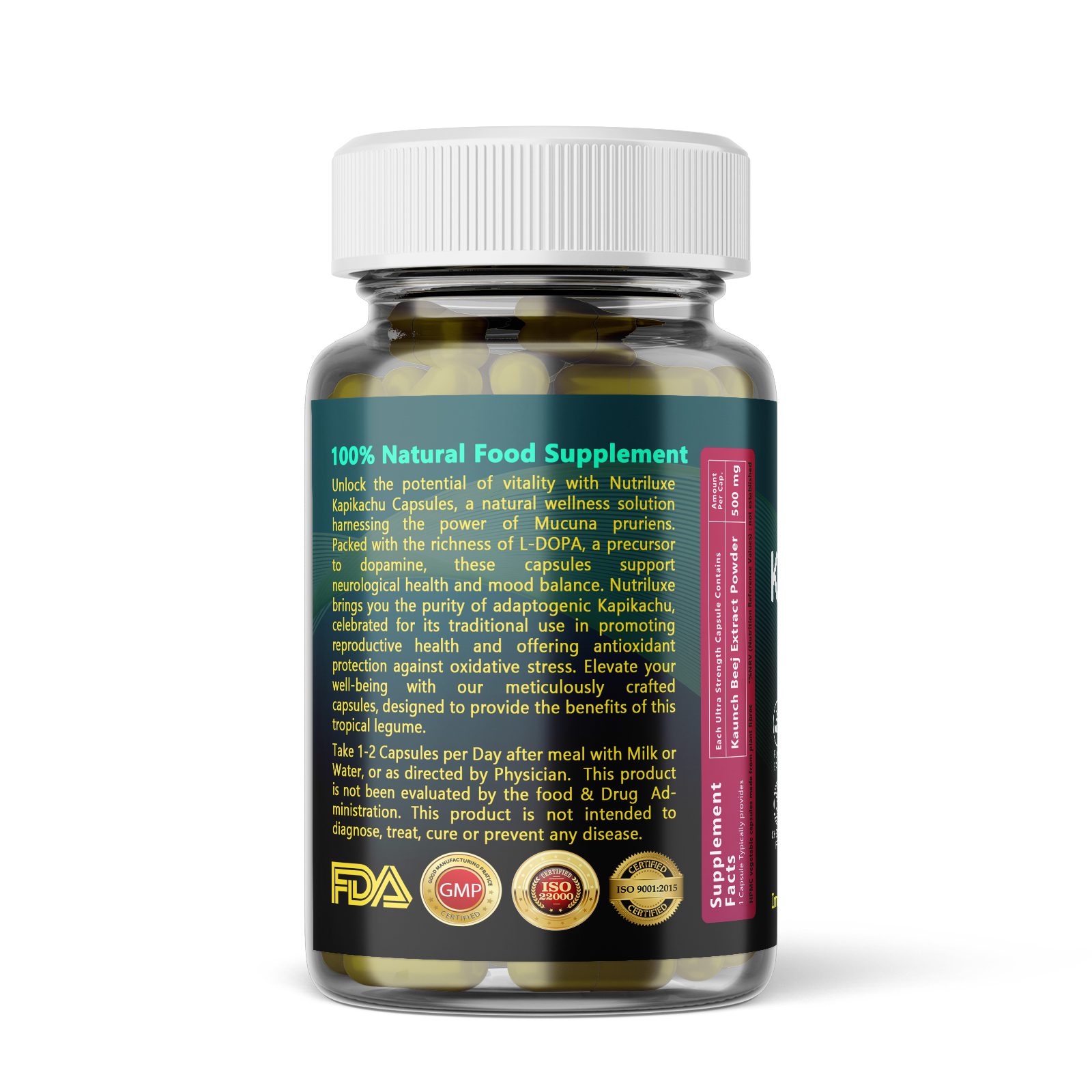 Nutriluxe Assurance: Rest assured with Nutriluxe’s commitment to quality. Kaunch Beej Extract Capsules are crafted with precision, free from artificial additives, and adhere to the principles of Ayurveda. Elevate your well-being with Nutriluxe Kaunch Beej Extract Capsules, where the potency of nature meets the precision of modern wellness.