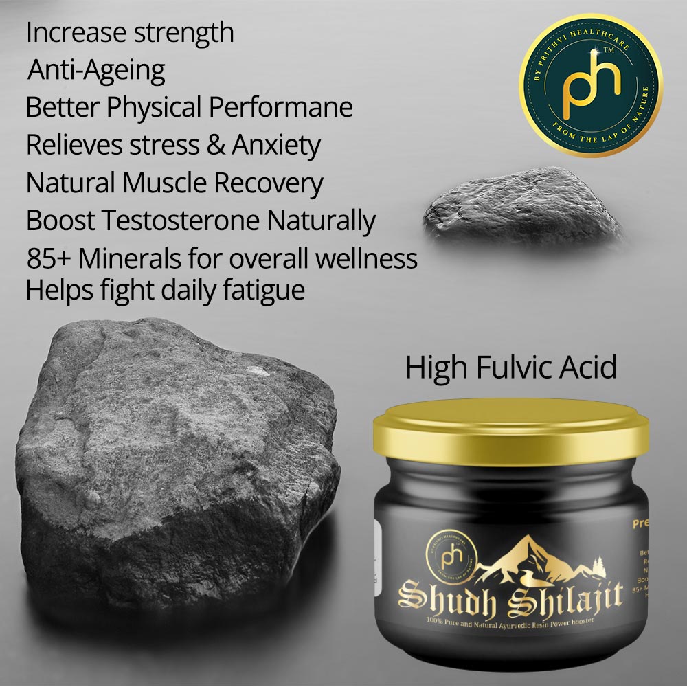 Our Shilajit resin is rich in Fulvic Acid, humic compounds, and over 85 essential minerals, providing your body with natural energy and improving nutrient absorption. Unlike synthetic supplements, PH Shilajit is completely chemical-free, maintaining the authentic potency as recommended in Ayurvedic texts.